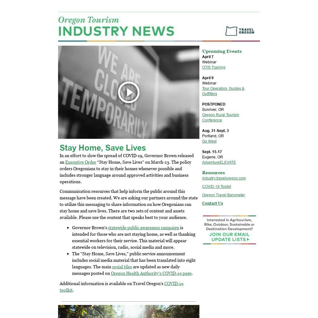 In order to help share information around how COVID-19 is impacting the travel industry, Travel Oregon’s research team is compiling state and national data on a weekly basis to share with external partners. Information provided will include, but is not limited to: