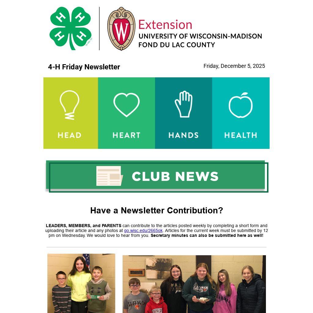 LEADERS, MEMBERS, and PARENTS can contribute to the articles posted weekly by completing a short form and uploading their article and any photos at go.wisc.edu/2665ok. Articles for the current week must be submitted by 12 pm on Wednesday. We would love to hear from you. Secretary minutes can also be submitted here as well!