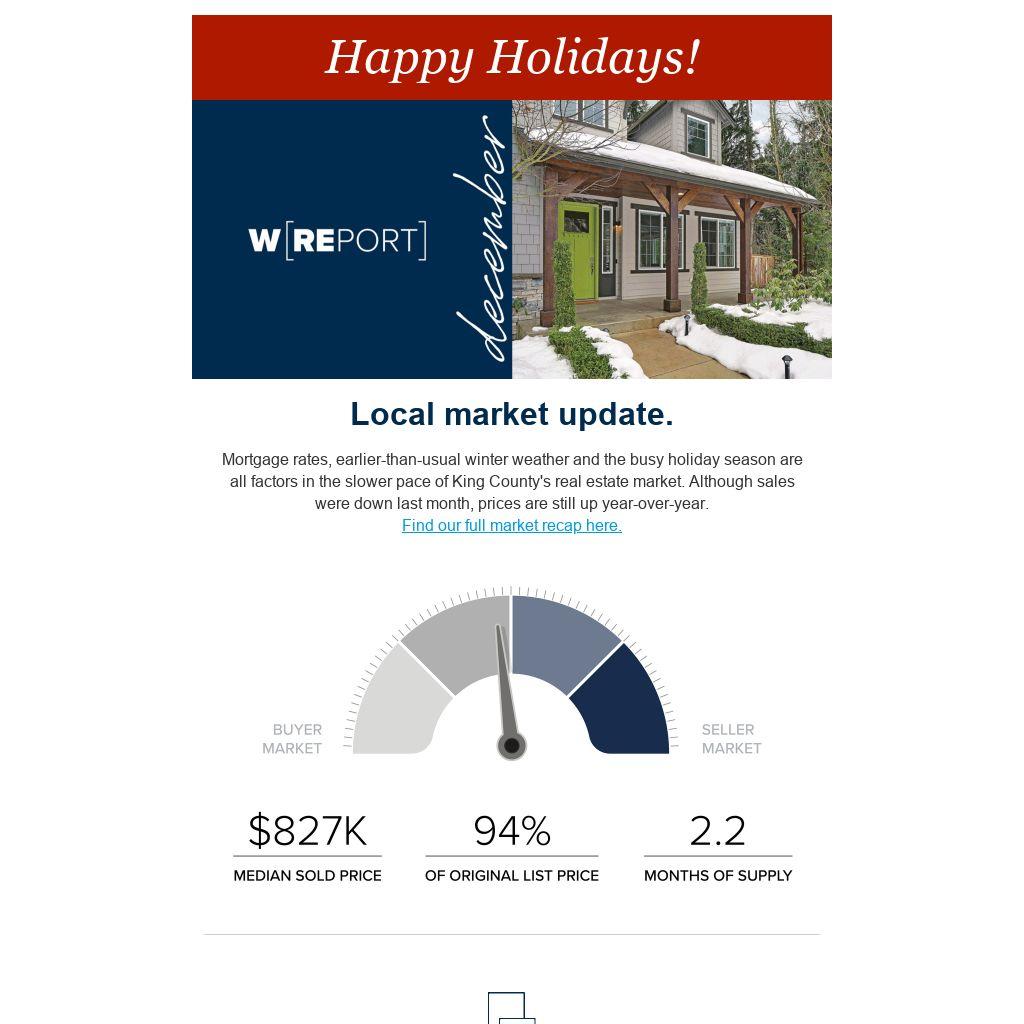 Mortgage rates, earlier-than-usual winter weather and the busy holiday season are all factors in the slower pace of King County's real estate market. Although sales were down last month, prices are still up year-over-year. Find our full market recap here.