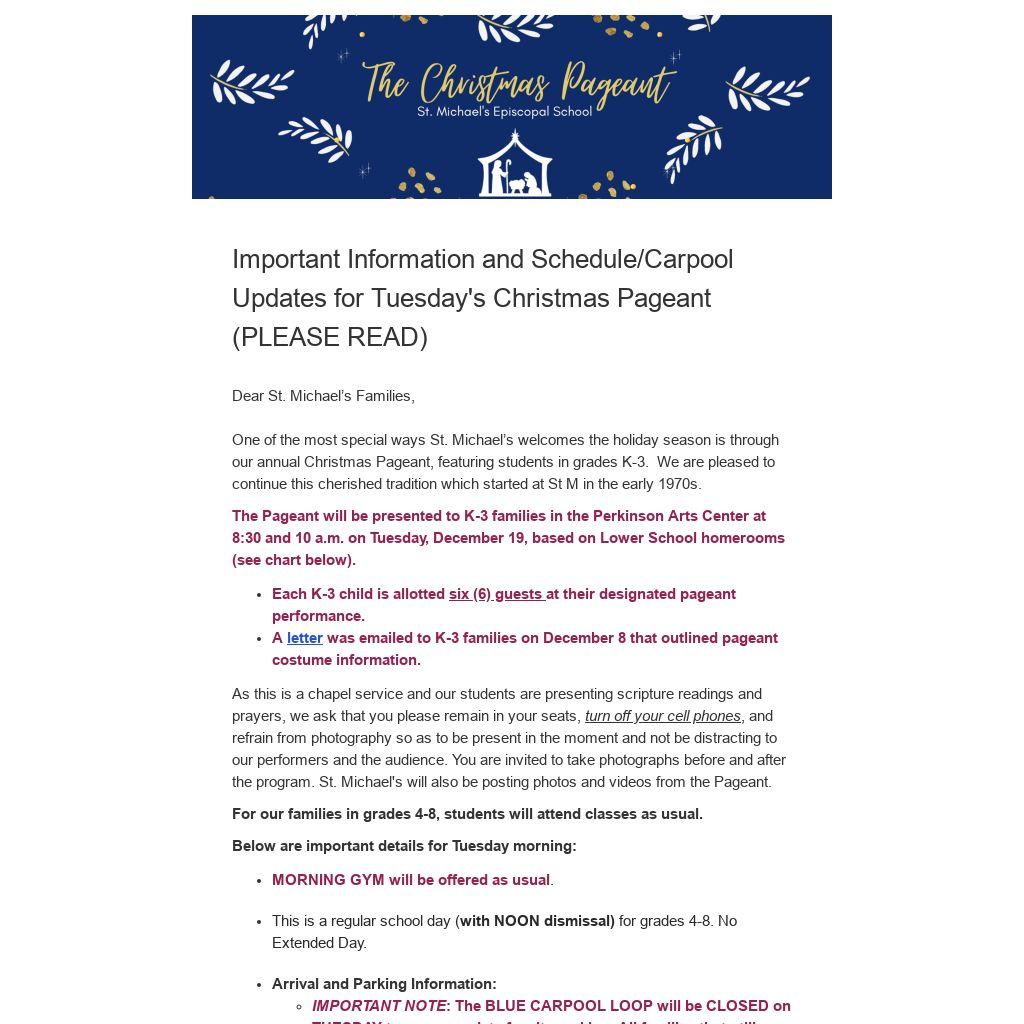 Important Information and Schedule/Carpool Updates for Tuesday's Christmas Pageant (PLEASE READ)