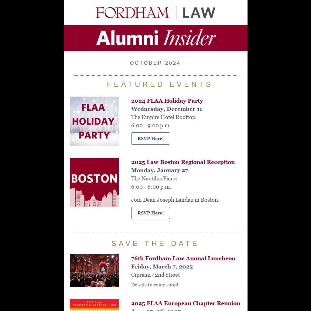 Nominees must be alumni of Fordham Law School and demonstrate the School's mission of "In the Service of Others." You may submit nominations at the button below. All nominations will be reviewed by the FLAA Nominating Committee, comprised of the following alumni: