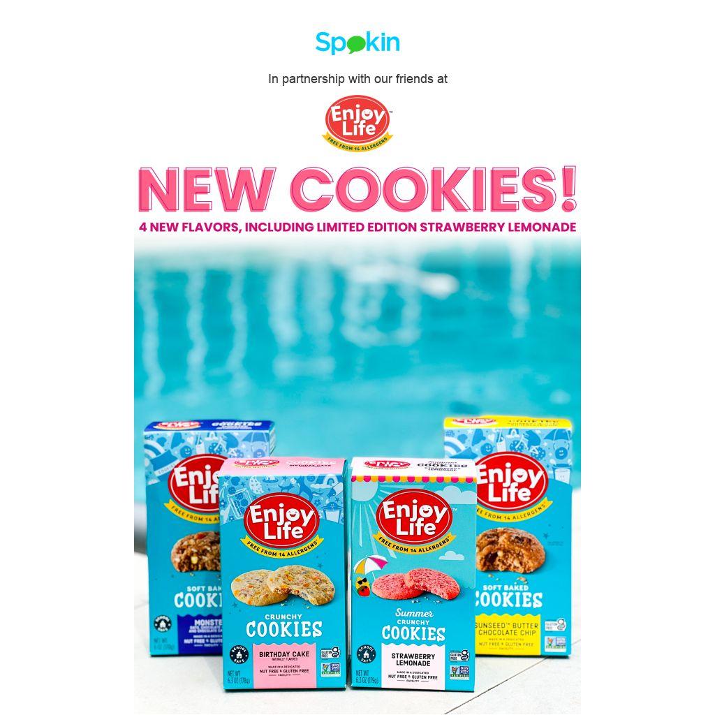 NEW cookie flavors from Enjoy Life are here, just in time for summer! Try all 4 including Birthday Cake, Monster, Sunseed™ Butter Chocolate Chip, and limited edition Strawberry Lemonade! Enjoy Life's new cookies are top 14 free and Spokin Verified. See all the allergen details on the Spokin app.