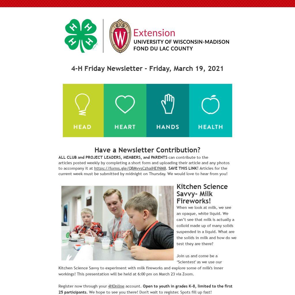 Conversation Corner: Spring ProgrammingNew program guidance for April was shared on March 10 - Need help with what it means for your club or project? Join us and find out!Join the Conversation! Join us each month for a different Conversation Corner topic! Club and project leaders (youth and adult) from Fond du Lac, Ozaukee, and Washington Counties are invited to join these one-hour (optional) Zooms. These conversations are an opportunity for leaders to ask the Educators questions, brainstorm with other leaders, and share ideas!