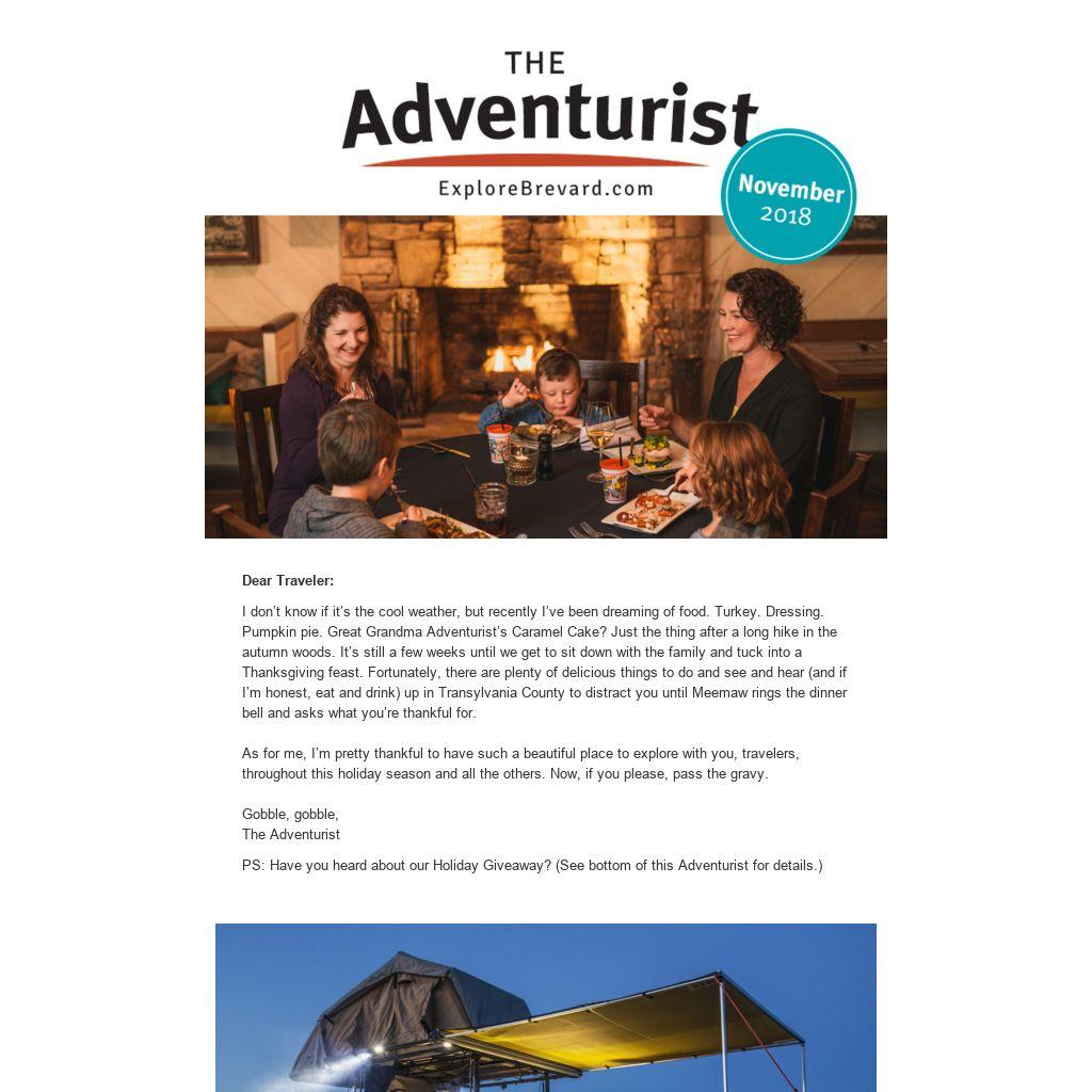 If you can’t wait, find all the details now and enter to win our holidays sweepstakes (cozy accommodations for two at The Bromfield Inn, dinners for two, lunch for two at Pisgah Fish Camp, and a $500 shopping spree) at ExploreBrevard.com/holidays