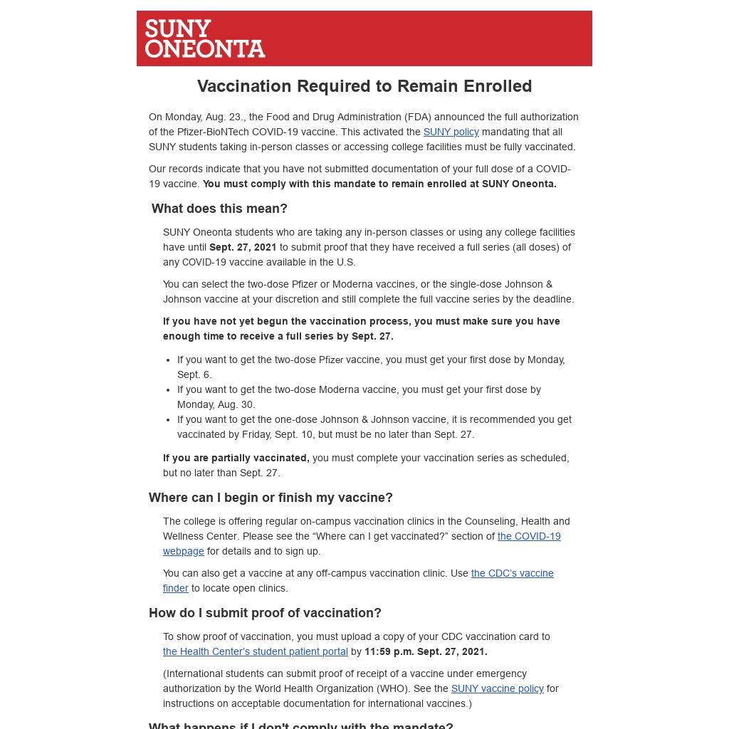 Our records indicate that you have not submitted documentation of your full dose of a COVID-19 vaccine. You must comply with this mandate to remain enrolled at SUNY Oneonta.
