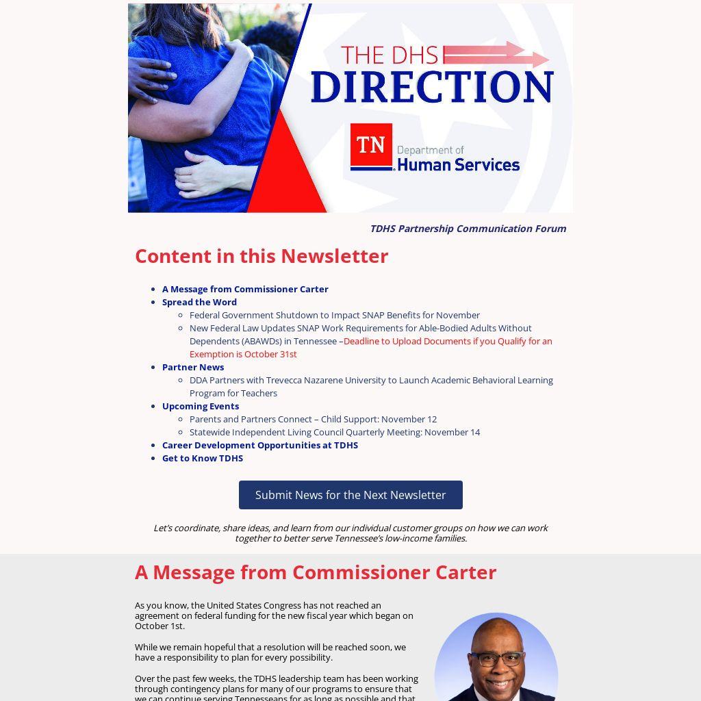 We know this uncertainty is difficult; however, please know that every decision is being made thoughtfully, with the goal of minimizing disruption and ensuring that, when federal operations resume, we are ready to adjust quickly and serve without delay. To ensure our customers and partners remain informed, we will continue to share updates on our website as more information becomes available at: https://www.tn.gov/humanservices/federal-shutdown.html.