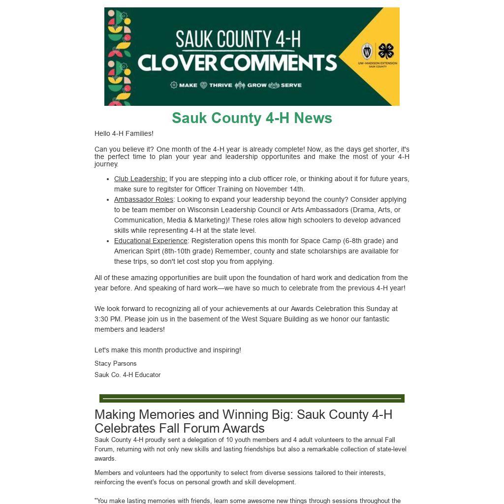 The success of the Sauk County delegation at Fall Forum—both in participation and awards—underscores the strength and quality of the county's 4-H program, thanks to its dedicated youth and exceptional volunteers.