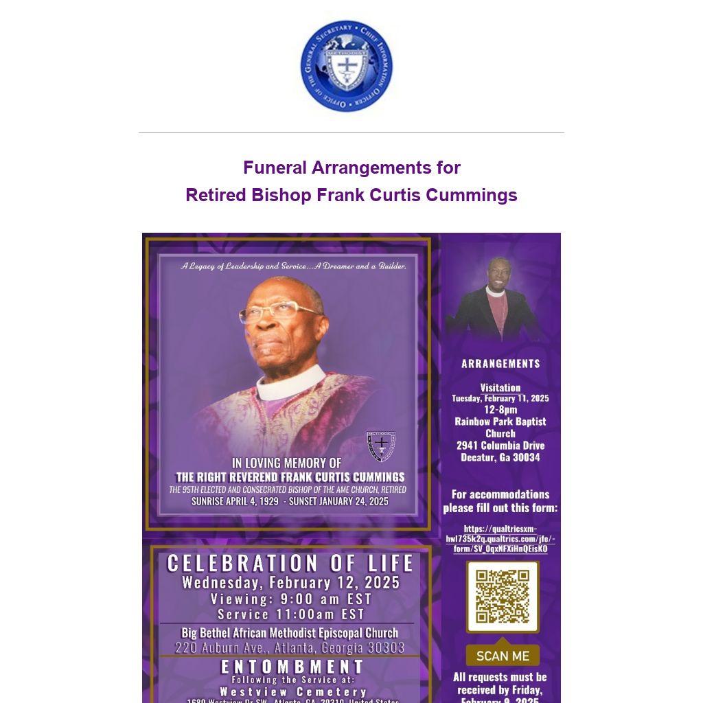 Bishop Frank Curtis Cummings was elected and consecrated as the 95th Bishop of the African Methodist Episcopal (AME) Church in 1976. A native of Richmond, Alabama, he was the seventh of nine children born to Annie and Edmond Cummings.