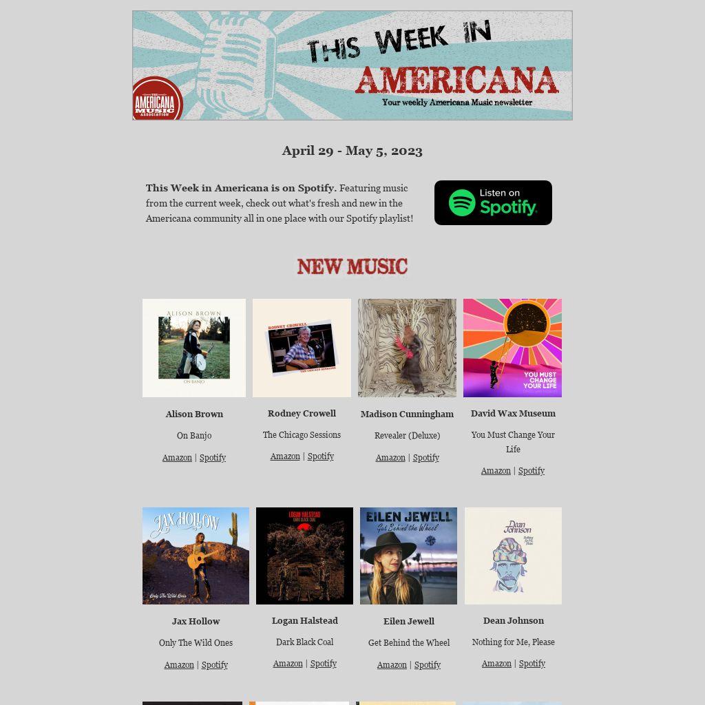 This Week in Americana is on Spotify. Featuring music from the current week, check out what's fresh and new in the Americana community all in one place with our Spotify playlist!