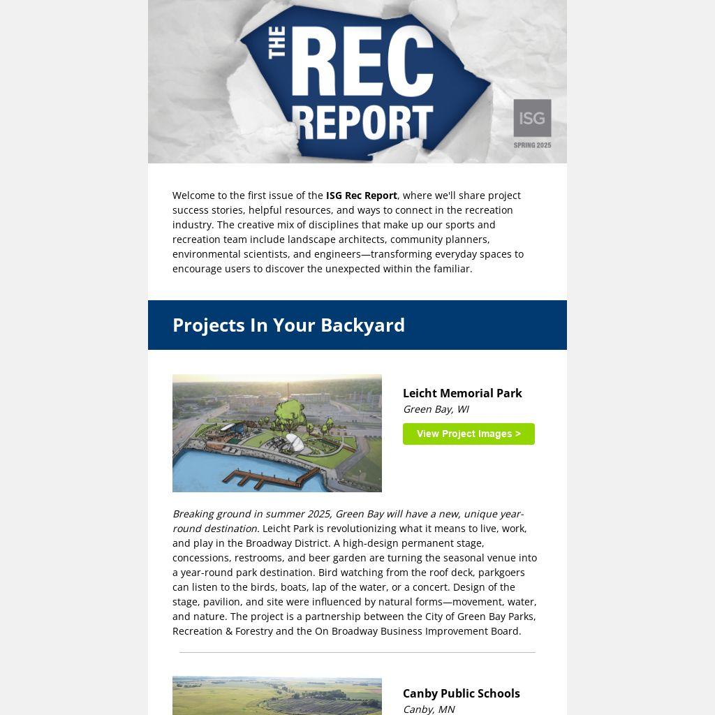 Welcome to the first issue of the ISG Rec Report, where we'll share project success stories, helpful resources, and ways to connect in the recreation industry. The creative mix of disciplines that make up our sports and recreation team include landscape architects, community planners, environmental scientists, and engineers—transforming everyday spaces to encourage users to discover the unexpected within the familiar.