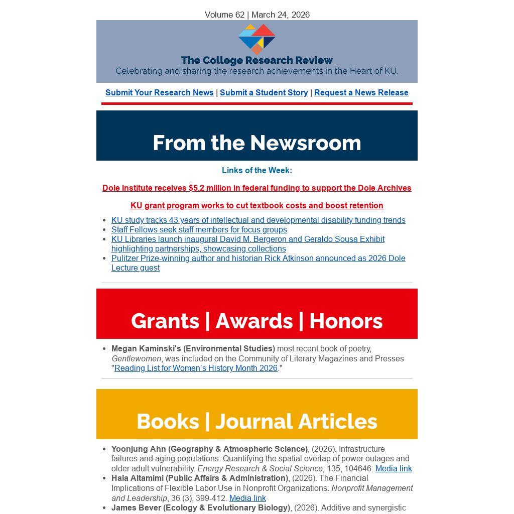 - Nathaniel Brunsell, Noah Ring (Geography & Atmospheric Science), Dorothy Daley (Environmental Studies), (2026). Climate and health governance: Opportunities and challenges addressing extreme heat in the United States. The Journal of Climate Change and Health, 28, 100635. Media link