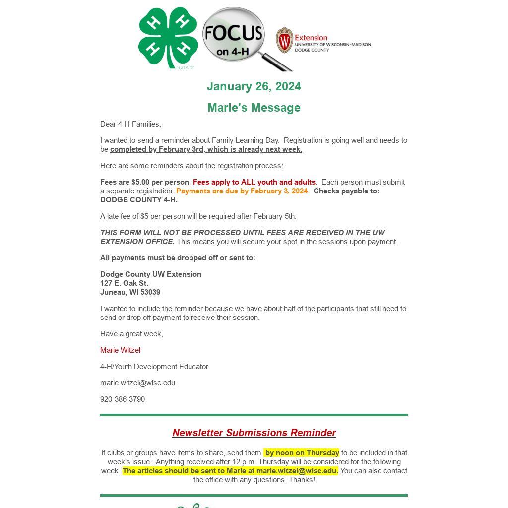 by noon on Thursday to be included in that week’s issue. Anything received after 12 p.m. Thursday will be considered for the following week. The articles should be sent to Marie at marie.witzel@wisc.edu. You can also contact the office with any questions. Thanks!