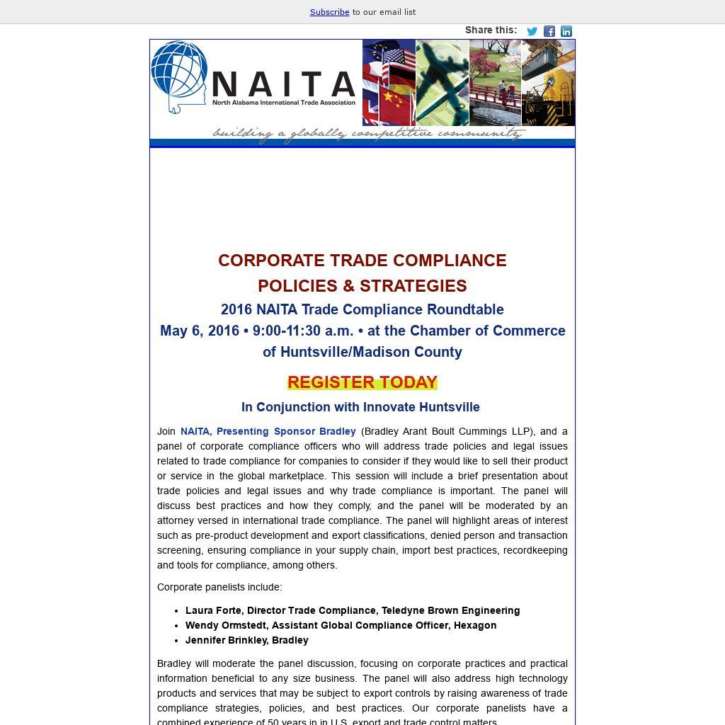 Join NAITA, Presenting Sponsor Bradley (Bradley Arant Boult Cummings LLP), and a panel of corporate compliance officers who will address trade policies and legal issues related to trade compliance for companies to consider if they would like to sell their product or service in the global marketplace. This session will include a brief presentation about trade policies and legal issues and why trade compliance is important. The panel will discuss best practices and how they comply, and the panel will be moderated by an attorney versed in international trade compliance. The panel will highlight areas of interest such as pre-product development and export classifications, denied person and transaction screening, ensuring compliance in your supply chain, import best practices, recordkeeping and tools for compliance, among others.