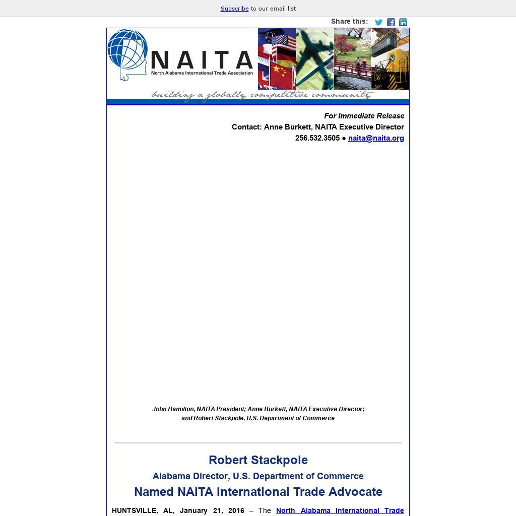 HUNTSVILLE, AL, January 21, 2016 – The North Alabama International Trade Association (NAITA), honors and recognizes an individual who has contributed significantly to the general advancement of international trade and the specific vision and mission of NAITA with the NAITA International Trade Advocate Award.