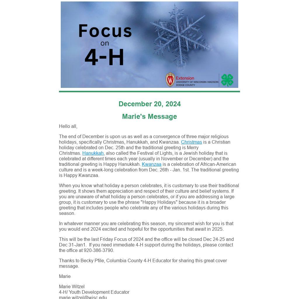 This will be the last Friday Focus of 2024 and the office will be closed Dec 24-25 and Dec 31-Jan1. If you need immediate 4-H support during the holidays, please contact the office at 920-386-3790.