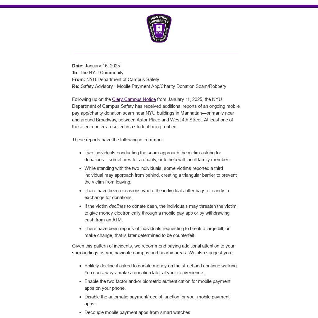 Clery Campus Notice from January 11, 2025, the NYU Department of Campus Safety has received additional reports of an ongoing mobile pay app/charity donation scam near NYU buildings in Manhattan—primarily near and around Broadway, between Astor Place and West 4th Street. At least one of these encounters resulted in a student being robbed.
