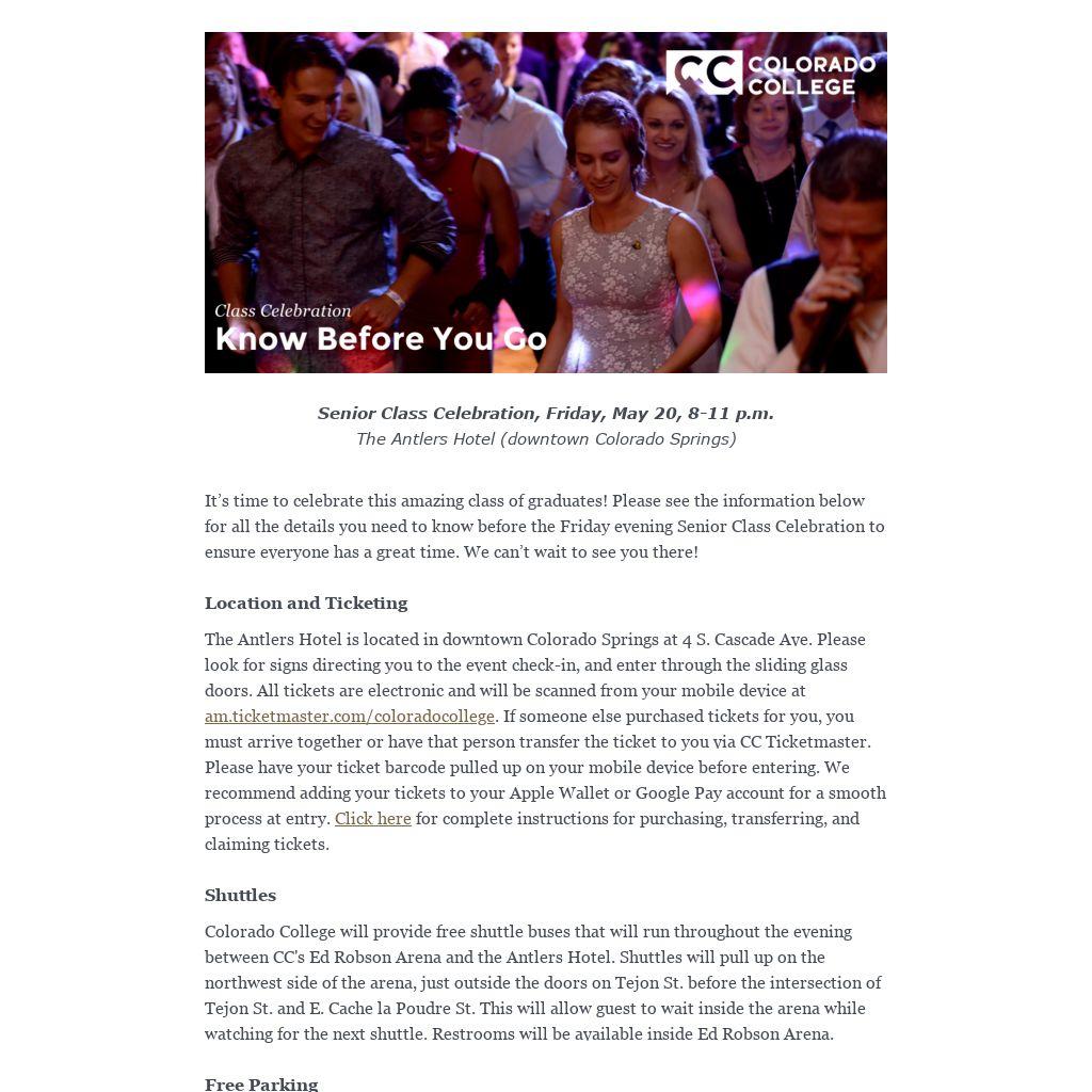 If you prefer to drive your own vehicle, the Antlers underground parking garage can be located from the north side of the building on Pikes Peak Ave., or from the west side on Sawatch St. When you pull into the garage, pull the pink ticket from dispenser. Bring the ticket with you, and follow the Antlers signs to get to the elevator banks on all three levels of parking. You can get your parking ticket validated at the Class Celebration ticketing check-in table. Once you have the ticket validated, do not put it by your phone! This tends to demagnetize the parking ticket. Parking is for event time only; no overnight parking.