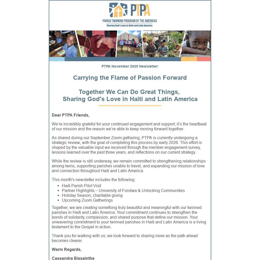 As of October 29, 2025, we have received 41 applications from PTPA members interested in participating in the Haiti Parish Visit Pilot. These applications are currently under review, and shortlisted parishes within the northern region of Haiti will be contacted shortly to finalize the list and coordinate logistical details for the November visits.