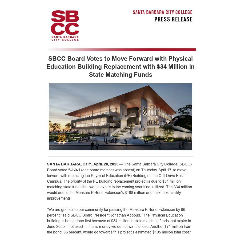 SANTA BARBARA, Calif., April. 28, 2025 — The Santa Barbara City College (SBCC) Board voted 5-1-0-1 (one board member was absent) on Thursday, April 17, to move forward with replacing the Physical Education (PE) Building on the Cliff Drive East Campus. The priority of the PE building replacement project is due to $34 million matching state funds that would expire in the coming year if not utilized. The $34 million would add to the Measure P Bond Extension's $198 million and maximize facility improvements.
