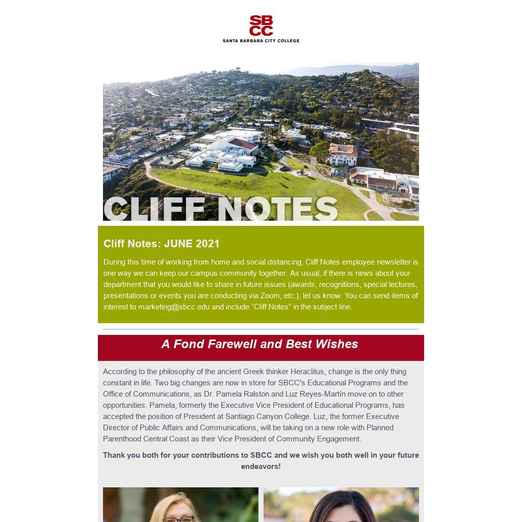 During this time of working from home and social distancing, Cliff Notes employee newsletter is one way we can keep our campus community together. As usual, if there is news about your department that you would like to share in future issues (awards, recognitions, special lectures, presentations or events you are conducting via Zoom, etc.), let us know. You can send items of interest to marketing@sbcc.edu and include “Cliff Notes” in the subject line.