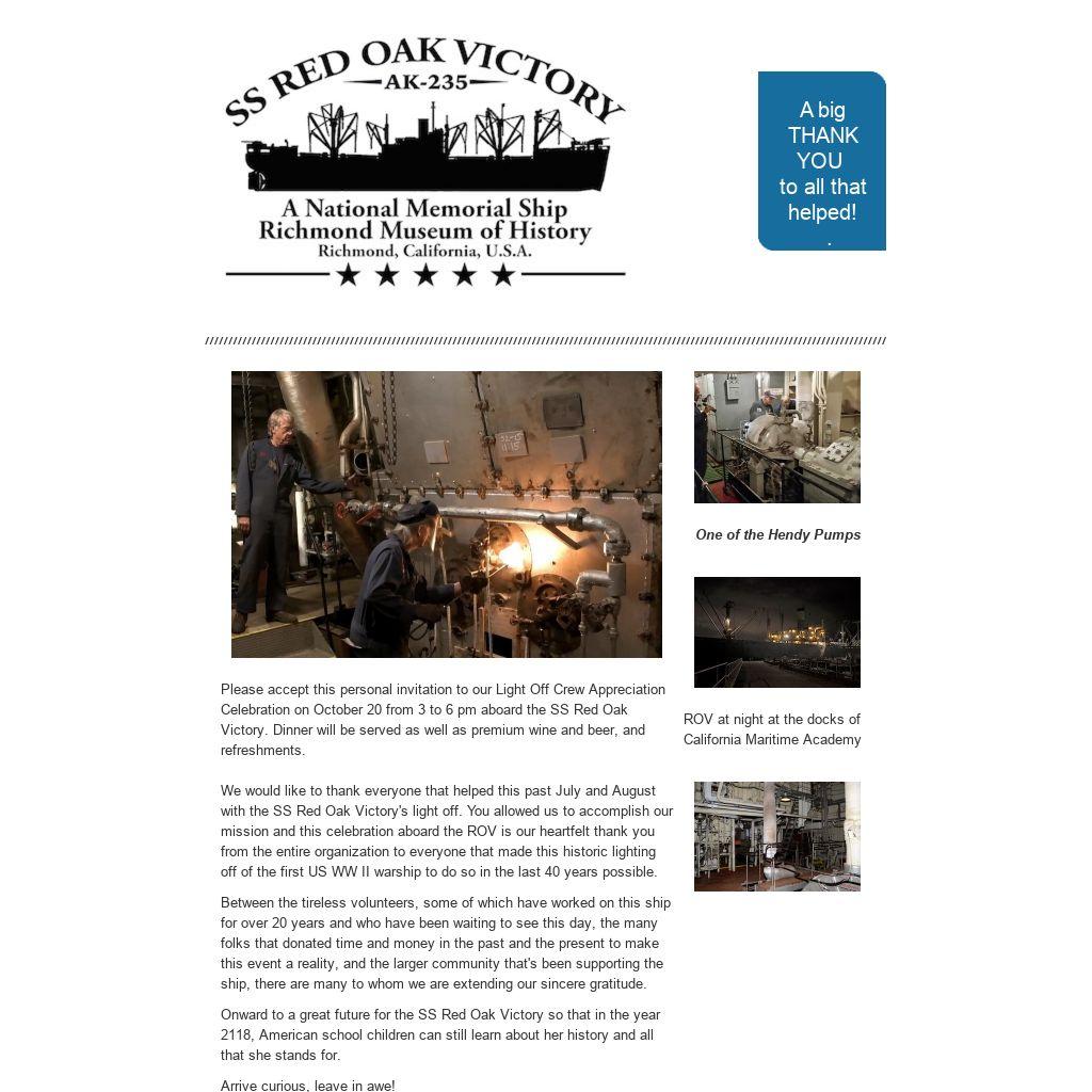 We would like to thank everyone that helped this past July and August with the SS Red Oak Victory's light off. You allowed us to accomplish our mission and this celebration aboard the ROV is our heartfelt thank you from the entire organization to everyone that made this historic lighting off of the first US WW II warship to do so in the last 40 years possible.