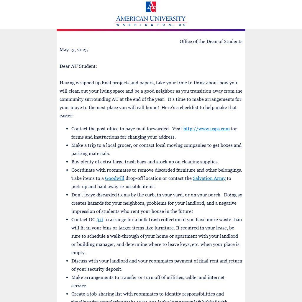 Having wrapped up final projects and papers, take your time to think about how you will clean out your living space and be a good neighbor as you transition away from the community surrounding AU at the end of the year. It’s time to make arrangements for your move to the next place you will call home! Here’s a checklist to help make that easier: