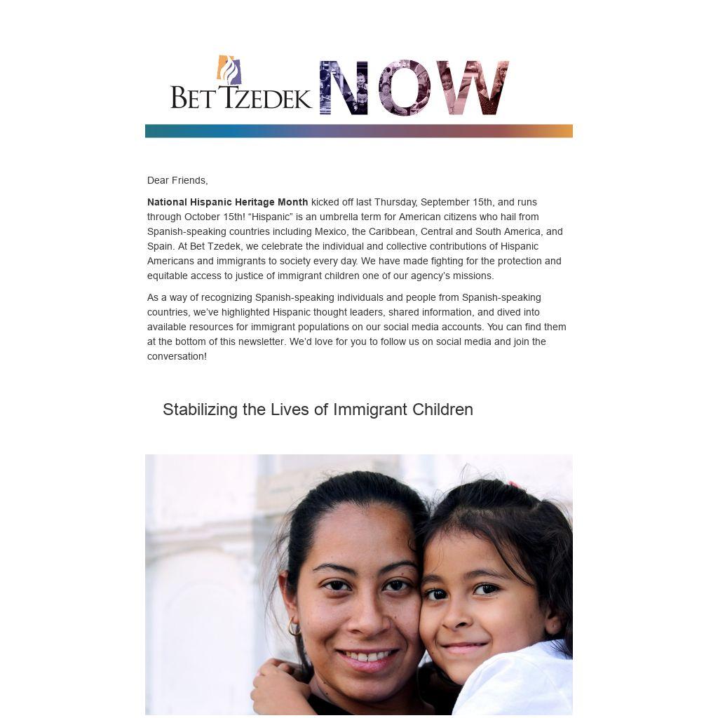 National Hispanic Heritage Month kicked off last Thursday, September 15th, and runs through October 15th! “Hispanic” is an umbrella term for American citizens who hail from Spanish-speaking countries including Mexico, the Caribbean, Central and South America, and Spain. At Bet Tzedek, we celebrate the individual and collective contributions of Hispanic Americans and immigrants to society every day. We have made fighting for the protection and equitable access to justice of immigrant children one of our agency’s missions.