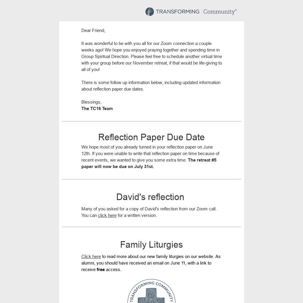 It was wonderful to be with you all for our Zoom connection a couple weeks ago! We hope you enjoyed praying together and spending time in Group Spiritual Direction. Please feel free to schedule another virtual time with your group before our November retreat, if that would be life-giving to all of you!