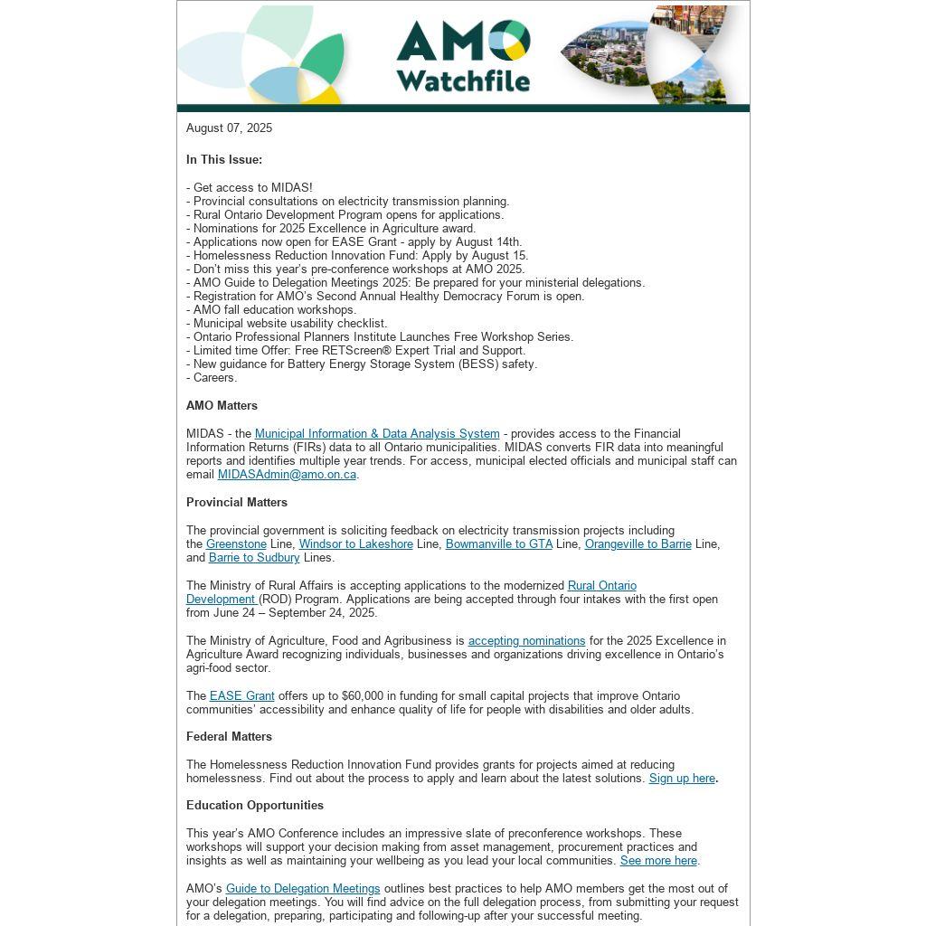 AMO is pleased to support OPPI in developing a series of free workshops, offered both in person and virtually, to address the shortage of planners in Ontario. Registration will open late August, so stay tuned.
