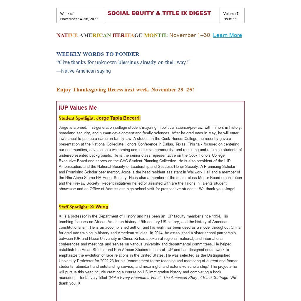 Digest issues are emailed every Monday morning. Send all information concerning your event to social-equity@iup.edu, and we will include it in the appropriate weekly issue. Also, please be sure to enter your event in the CMS on the DIVERSITY, STUDENT, and CENTRAL CALENDARS so that it will receive wider marketing, appear in IUP Now, and achieve greater attendance.