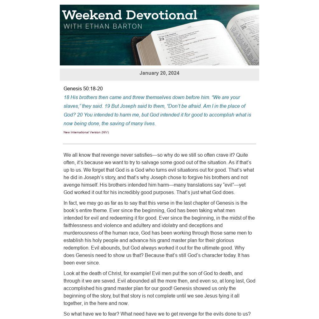 We all know that revenge never satisfies—so why do we still so often crave it? Quite often, it’s because we want to try to salvage some good out of the situation. As if that’s up to us. We forget that God is a God who turns evil situations out for good. That’s what he did in Joseph’s story, and that’s why Joseph chose to forgive his brothers and not avenge himself. His brothers intended him harm—many translations say “evil”—yet God worked it out for his incredibly good purposes. That’s just what God does.