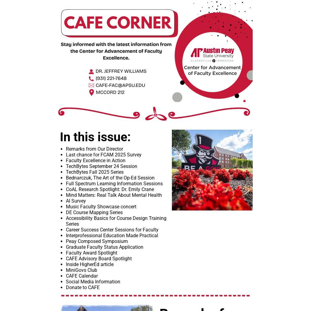 We have another CAFE Advisory Board meeting this coming Monday and I hope you'll be able to make time to complete the FCAM Survey shared below here one last time in the newsletter. As always, we welcome your ideas on how CAFE can better serve you. Please don't hesitate to reach out at williamsjj@apsu.edu or 931-221-7648.