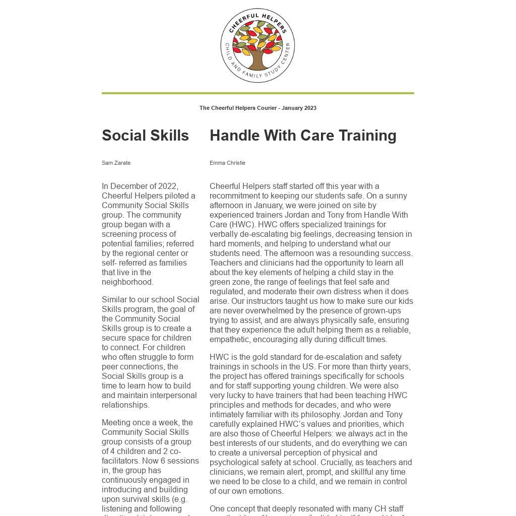 Cheerful Helpers staff started off this year with a recommitment to keeping our students safe. On a sunny afternoon in January, we were joined on site by experienced trainers Jordan and Tony from Handle With Care (HWC). HWC offers specialized trainings for verbally de-escalating big feelings, decreasing tension in hard moments, and helping to understand what our students need. The afternoon was a resounding success. Teachers and clinicians had the opportunity to learn all about the key elements of helping a child stay in the green zone, the range of feelings that feel safe and regulated, and moderate their own distress when it does arise. Our instructors taught us how to make sure our kids are never overwhelmed by the presence of grown-ups trying to assist, and are always physically safe, ensuring that they experience the adult helping them as a reliable, empathetic, encouraging ally during difficult times.