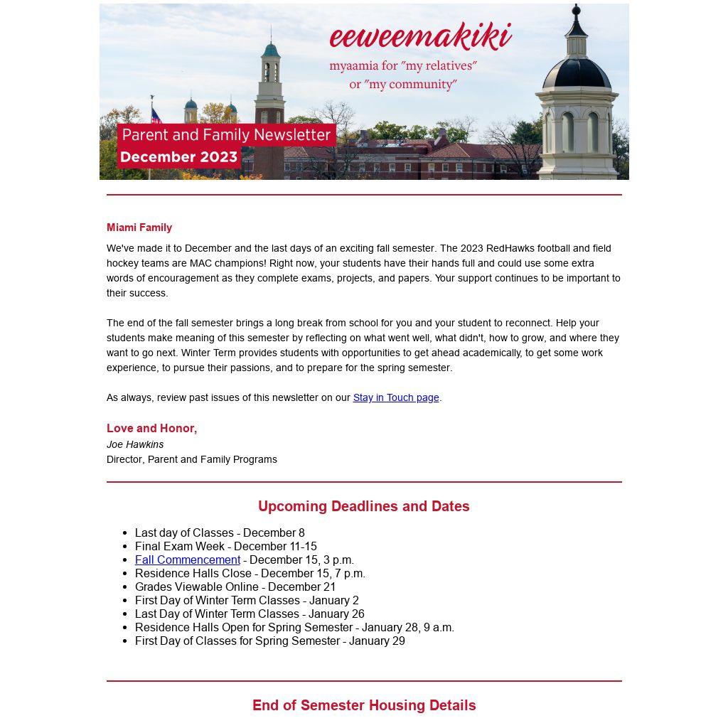We've made it to December and the last days of an exciting fall semester. The 2023 RedHawks football and field hockey teams are MAC champions! Right now, your students have their hands full and could use some extra words of encouragement as they complete exams, projects, and papers. Your support continues to be important to their success.