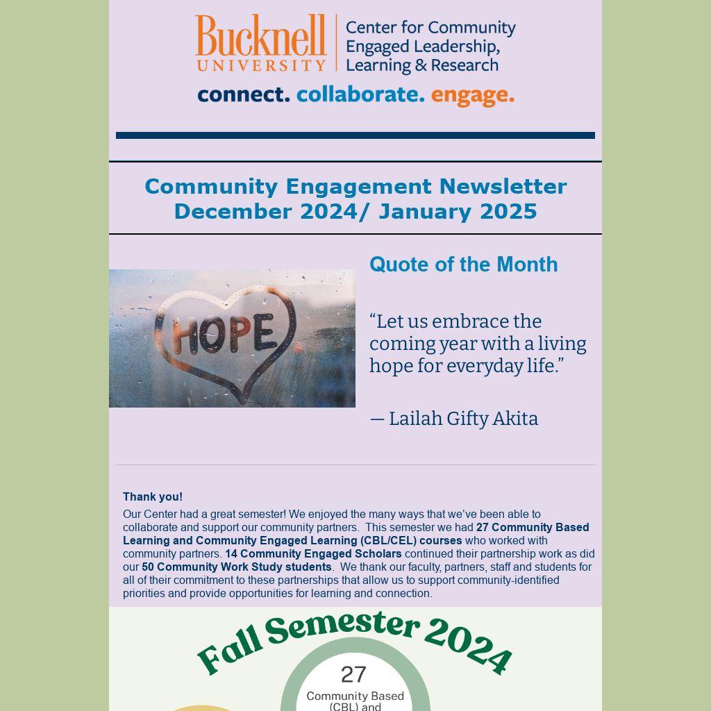 Summer ‘25 Community Partner Summer Intern Host Site Applications: If you are a local Community Partner with regional programming addressing community-identified priorities, and you are interested in hosting a Bucknell summer student intern for eight weeks in Summer ‘25, apply here to indicate your interest and describe how you would host a student related to your summer programming and services. Students are compensated at no cost to the Community Partner organization.