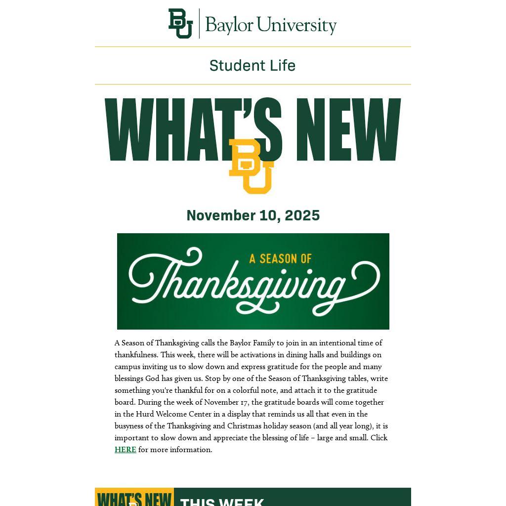 If you are a department or Baylor student organization and have items you would like to see appear in What's New BU, submit them for consideration by Friday at 8 a.m. by clicking here or emailing them to whatsnew@baylor.edu. View past issues of What’s New BU here.