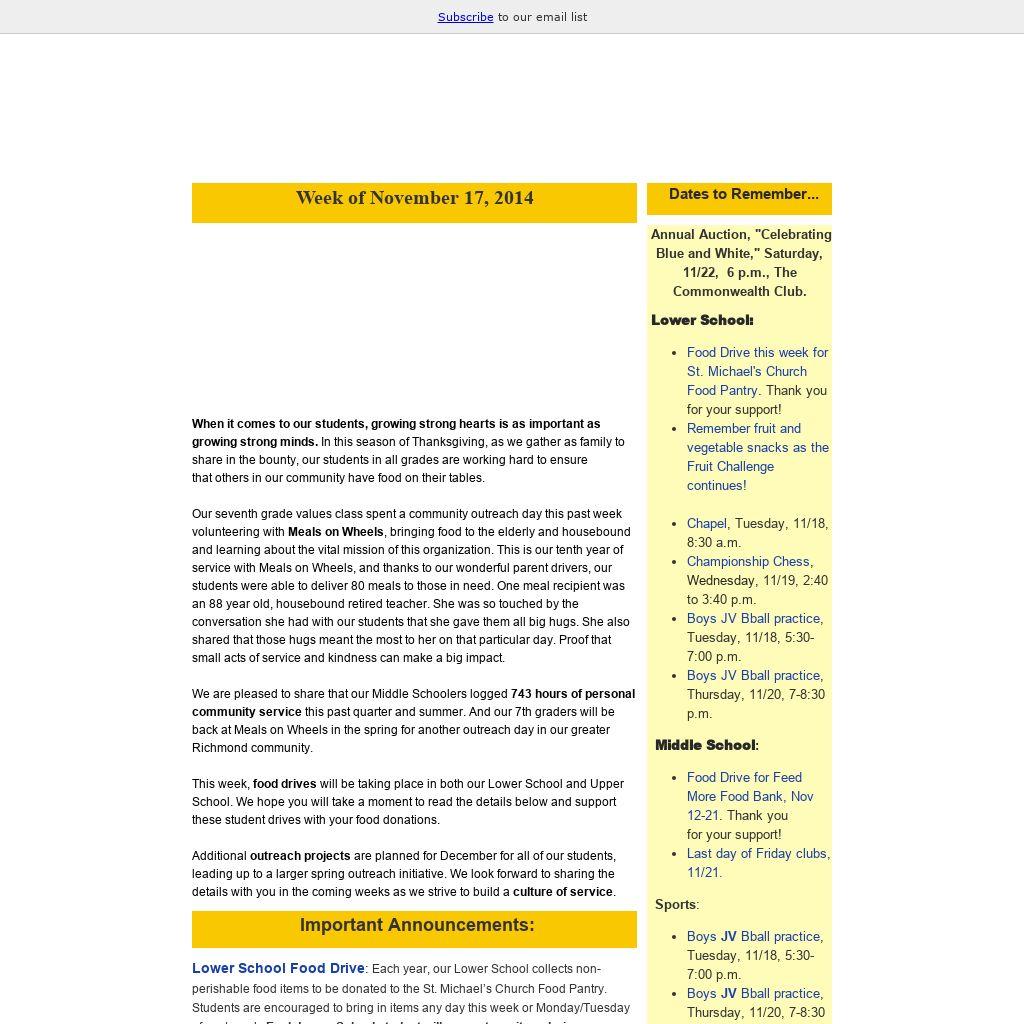 Lower School Food Drive: Each year, our Lower School collects non-perishable food items to be donated to the St. Michael’s Church Food Pantry. Students are encouraged to bring in items any day this week or Monday/Tuesday of next week. Each Lower School student will present one item during our Thanksgiving chapel service Tuesday, November 25. Thank you for your support.
