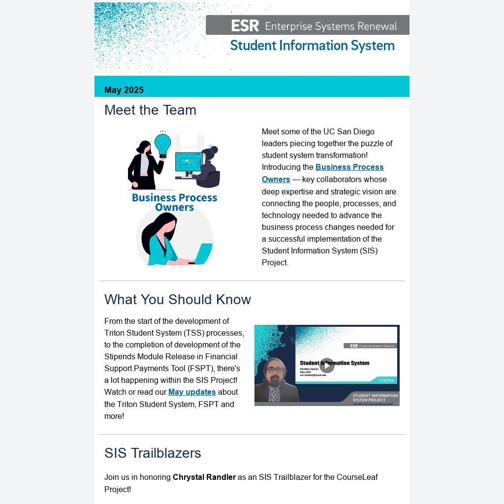 From the start of the development of Triton Student System (TSS) processes, to the completion of development of the Stipends Module Release in Financial Support Payments Tool (FSPT), there's a lot happening within the SIS Project! Watch or read our May updates about the Triton Student System, FSPT and more!