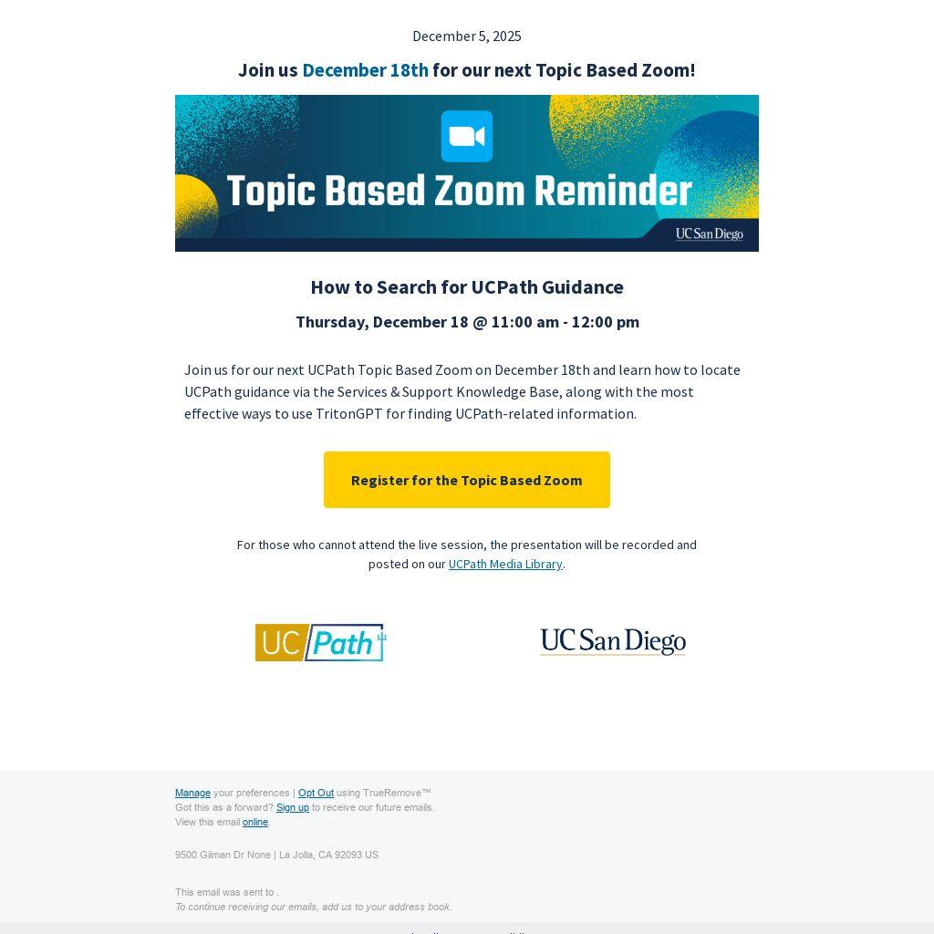 Join us for our next UCPath Topic Based Zoom on December 18th and learn how to locate UCPath guidance via the Services & Support Knowledge Base, along with the most effective ways to use TritonGPT for finding UCPath-related information.