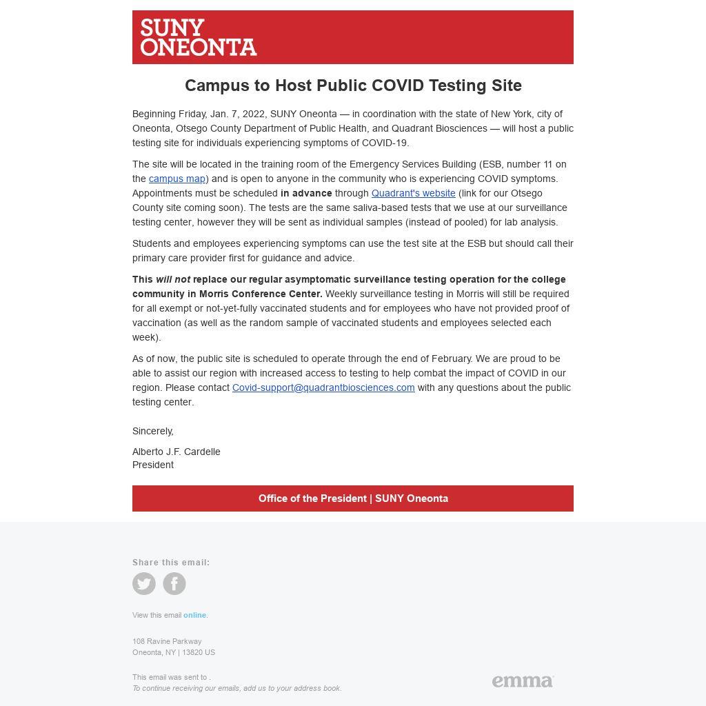 Beginning Friday, Jan. 7, 2022, SUNY Oneonta — in coordination with the state of New York, city of Oneonta, Otsego County Department of Public Health, and Quadrant Biosciences — will host a public testing site for individuals experiencing symptoms of COVID-19.