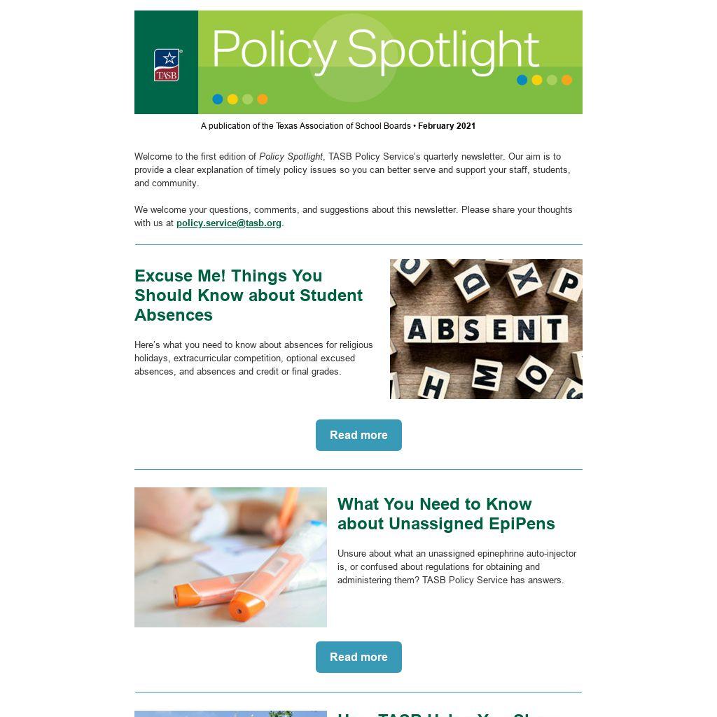 Welcome to the first edition of Policy Spotlight, TASB Policy Service’s quarterly newsletter. Our aim is to provide a clear explanation of timely policy issues so you can better serve and support your staff, students, and community.