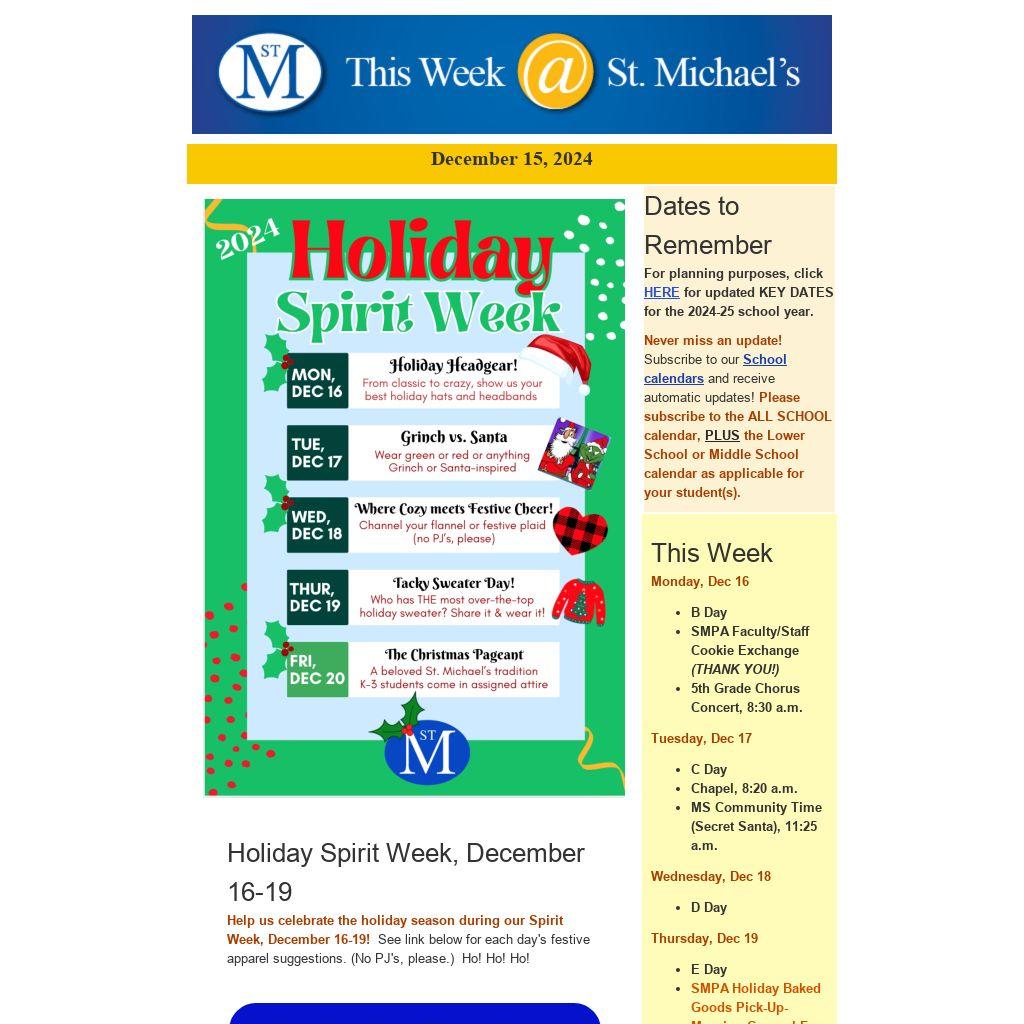 Help us celebrate the holiday season during our Spirit Week, December 16-19! See link below for each day's festive apparel suggestions. (No PJ's, please.) Ho! Ho! Ho!