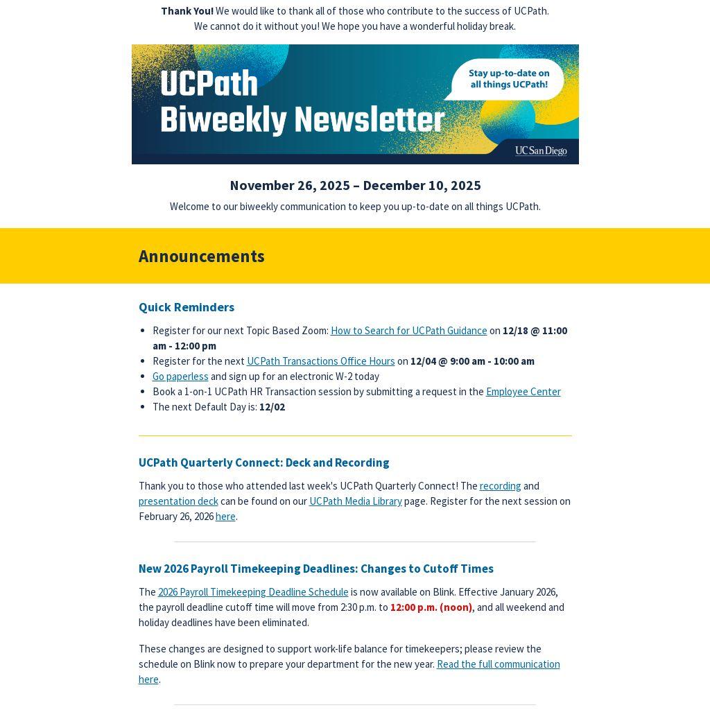 - As a reminder, due to the New Year holiday, UCPath Center will issue monthly paychecks and schedule direct deposits to post on January 2, 2026, for monthly employees.