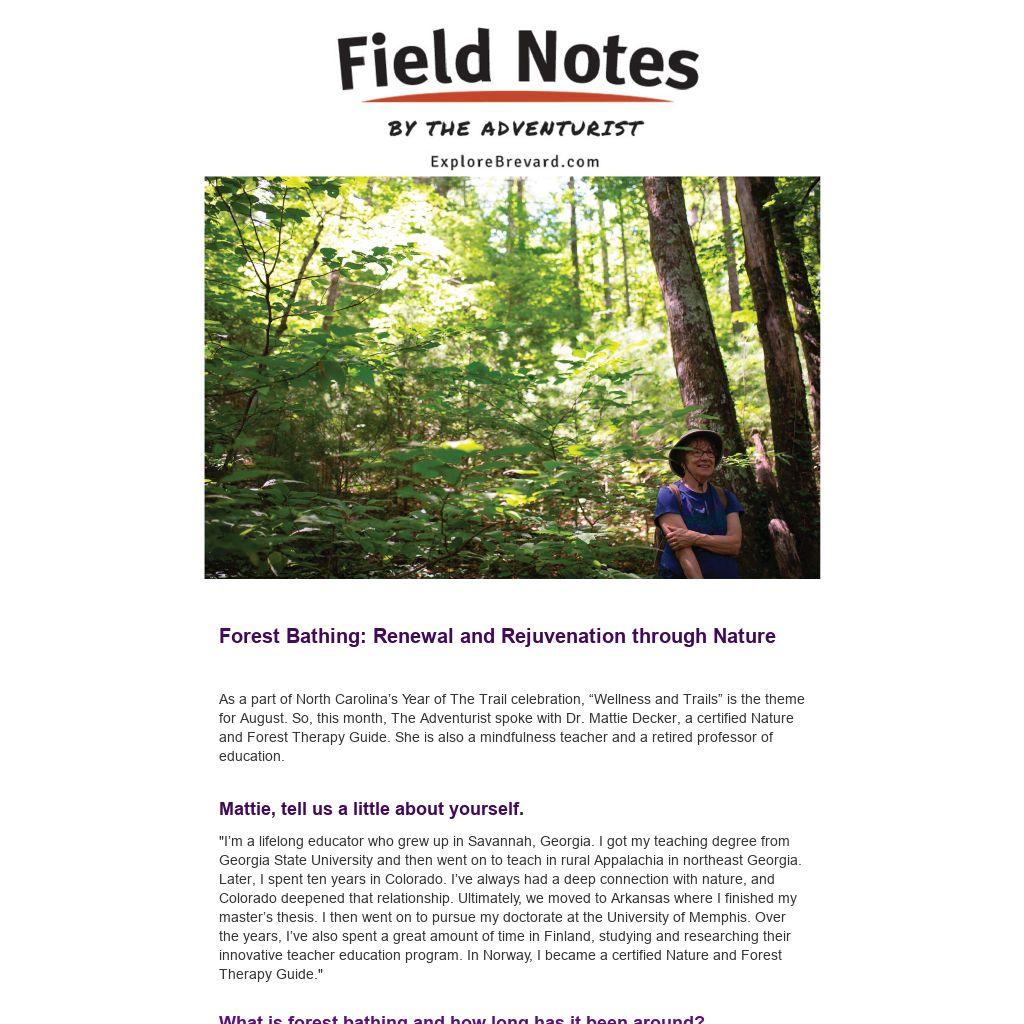 As a part of North Carolina’s Year of The Trail celebration, “Wellness and Trails” is the theme for August. So, this month, The Adventurist spoke with Dr. Mattie Decker, a certified Nature and Forest Therapy Guide. She is also a mindfulness teacher and a retired professor of education.