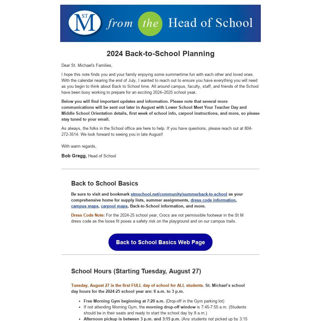 I hope this note finds you and your family enjoying some summertime fun with each other and loved ones. With the calendar nearing the end of July, I wanted to reach out to ensure you have everything you will need as you begin to think about Back to School time. All around campus, faculty, staff, and friends of the School have been busy working to prepare for an exciting 2024–2025 school year.