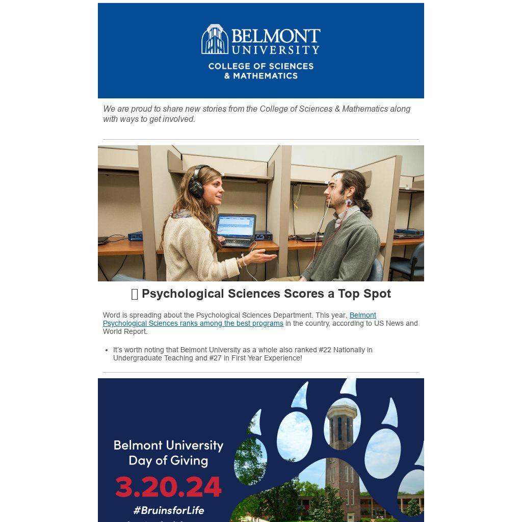 - It’s worth noting that Belmont University as a whole also ranked #22 Nationally in Undergraduate Teaching and #27 in First Year Experience!