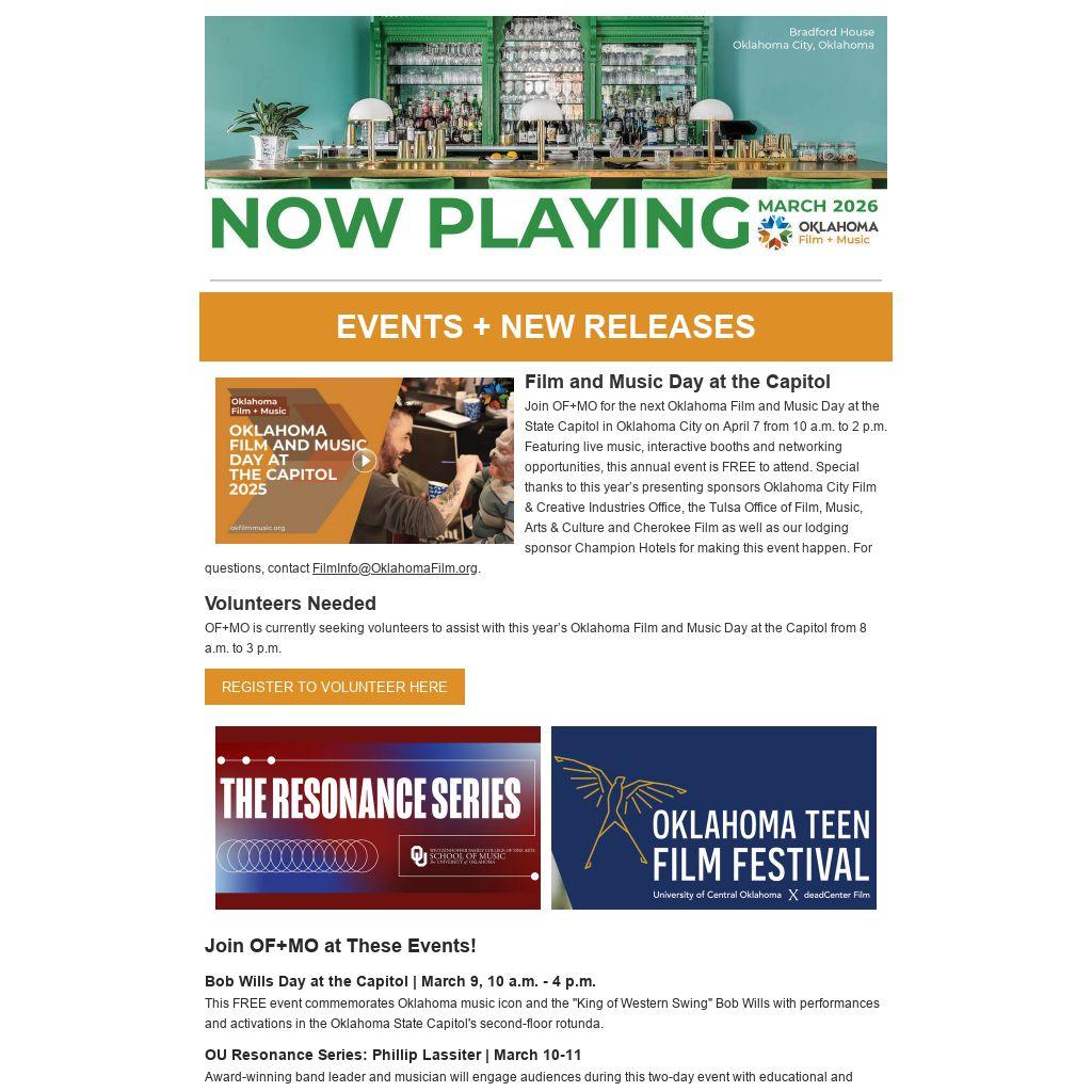 Volunteers Needed OF+MO is currently seeking volunteers to assist with this year’s Oklahoma Film and Music Day at the Capitol from 8 a.m. to 3 p.m.
