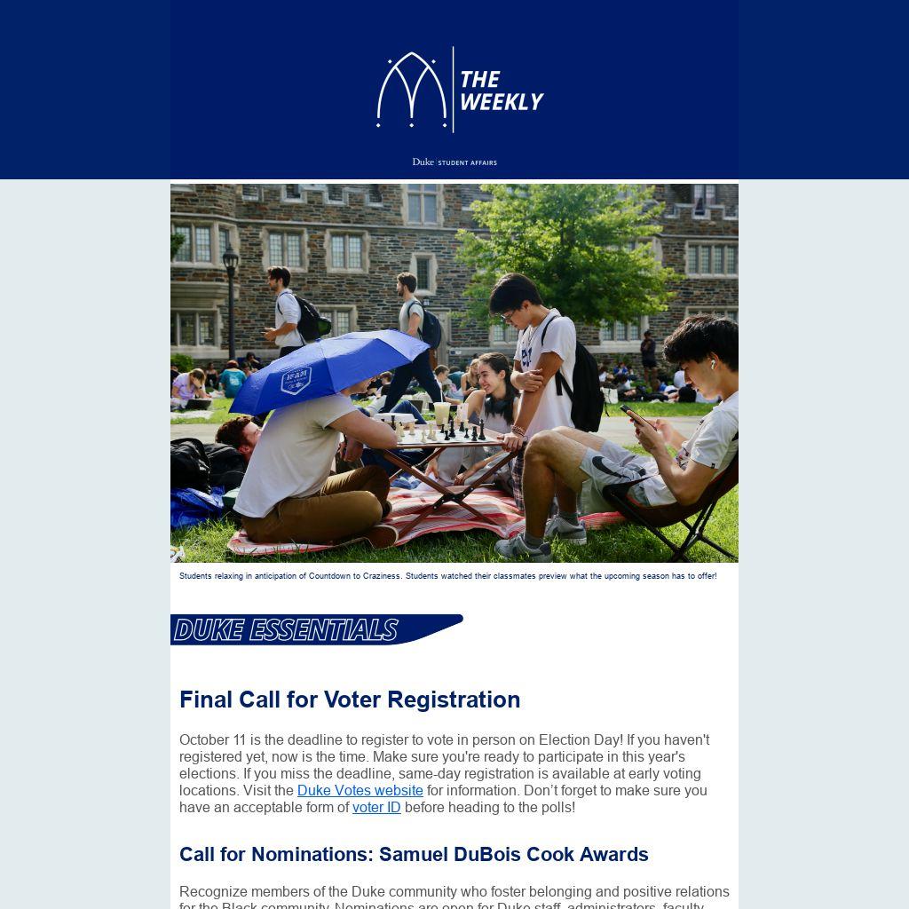 October 11 is the deadline to register to vote in person on Election Day! If you haven't registered yet, now is the time. Make sure you're ready to participate in this year's elections. If you miss the deadline, same-day registration is available at early voting locations. Visit the Duke Votes website for information. Don’t forget to make sure you have an acceptable form of voter ID before heading to the polls!