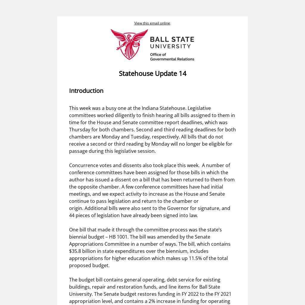 Please see below for a list of bills being tracked by Ball State Governmental Relations that have moved during the last week. As always, if you have any questions, please reach out to our office at gov@bsu.edu.