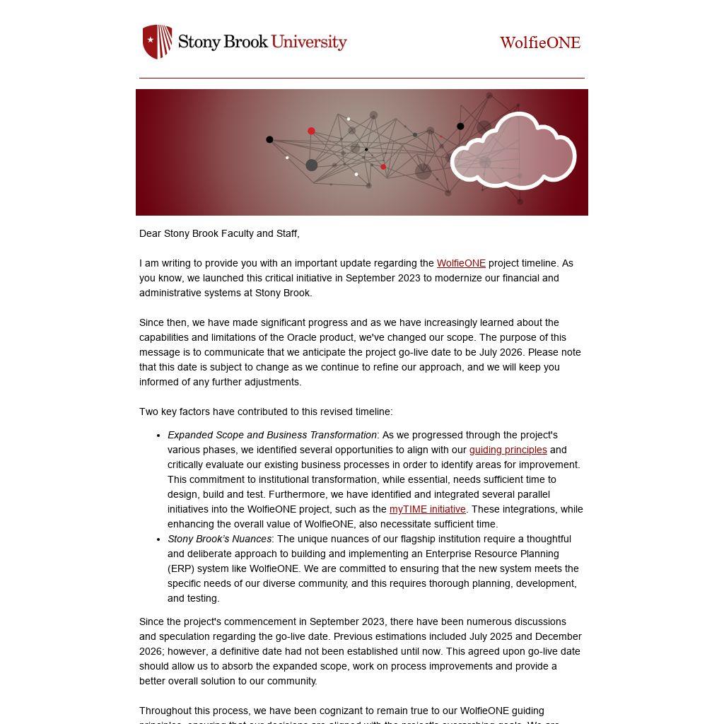 I am writing to provide you with an important update regarding the WolfieONE project timeline. As you know, we launched this critical initiative in September 2023 to modernize our financial and administrative systems at Stony Brook.